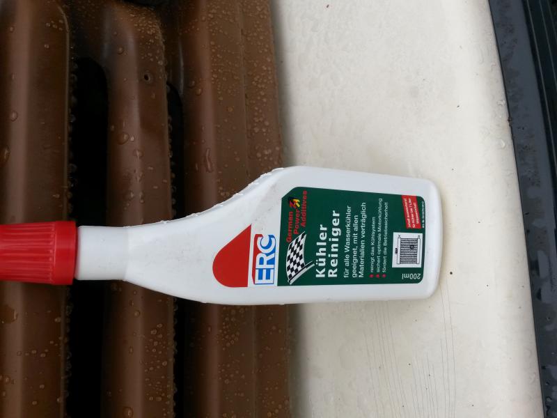 Also ganz einfaches Prozedere: Kühlerreiniger eingefüllt und ein paar sowieso notwendige Fahrten gemacht, damit das Zeug ordentlich bei Betriebstemperatur wirken kann.